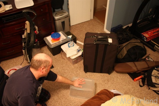 We had to come up with a way to get it... man that bugger was fast. Just as we have it cornered... it shoots right out in between us and into the middle of our room! Stewart had some fast ninja skills to get the box over the top of it... whew!
