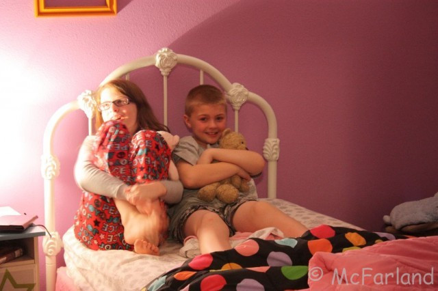 While all of this was going on... Walker had crawled into Ainsley's bed with her... both bears are grabbed onto tightly and there was constant chatter of... "Did you get it??" They look all fine and happy here... this was after mousie was disposed of and Daddy was making them laugh so that we could all go back to normal.