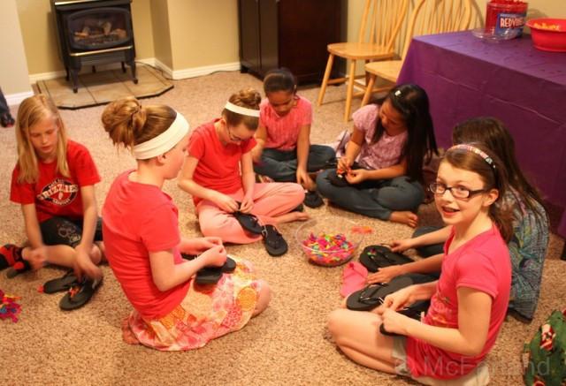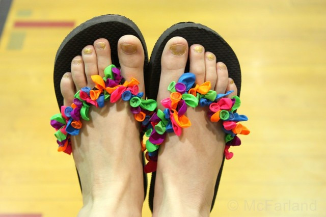 After a wee bit of substance it was time to P A R T Y... let the crafting begin! This year we made super cute flip flops. Which had water balloons double knotted onto them.